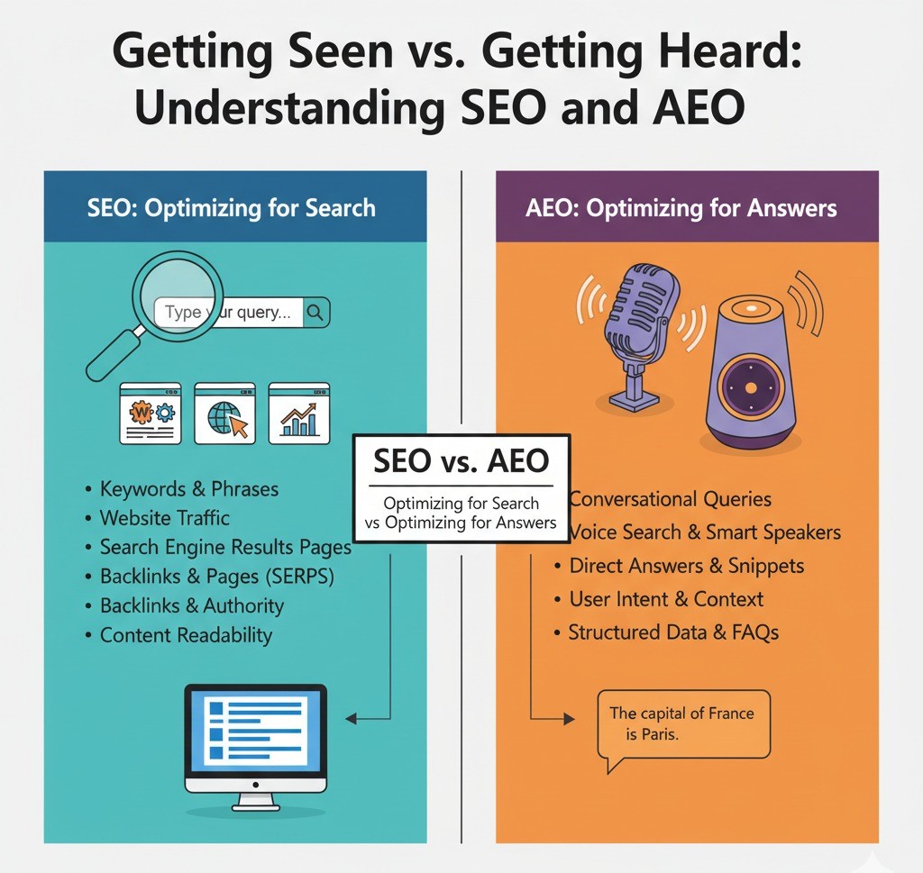 Unlike traditional SEO, which focuses on rankings and traffic, AEO focuses on understanding intent and delivering clarity. It ensures your brand’s content is not only visible but also valuable, making it the preferred source of answers for AI-driven platforms and users alike.